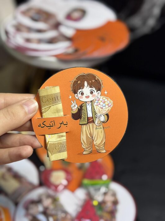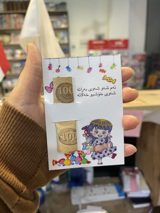بۆیە بیرۆکەی ئەوەم بۆ هات لەسەر کارتێکی نەخشێنراو پارەو شیرینی پێوە بلکێنم و بیبەخشمەوە، ئەم کارەشم لەسەر گیرفانی خۆم کردومەو کەس هاوکاری نەکردوم و مەبەستم لێی بازرگانی کردن و قازانج نیە، تەنها بۆ خۆمم دروست کردوە.
